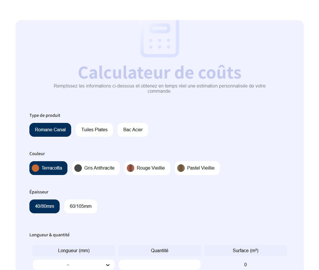 Notre estimateur de prix en ligne vous permet d’obtenir rapidement une idée précise du coût de votre future commande. Simple et intuitif, il vous suffit de sélectionner le type de panneau, l’épaisseur, la couleur, les dimensions et les quantités souhaitées pour voir automatiquement s’afficher le détail de votre devis, incluant la surface calculée et le prix total. Grâce à cet outil vous pourrez gagner du temps et obtenir une meilleure visibilité budgétaire avant de finaliser votre achat.